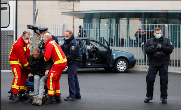 Une voiture sur les flancs de laquelle étaient gribouillés des slogans a percuté la porte du bureau de la chancelière allemande Angela Merkel à Berlin le 25 novembre 2020, et la police n'est pas certaine du motif du conducteur.